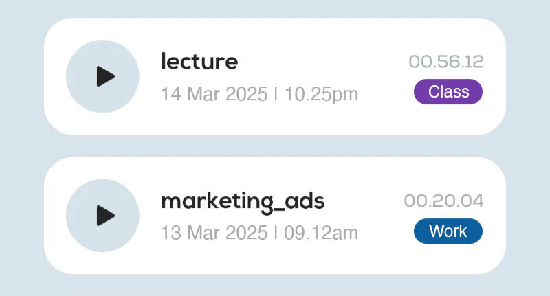 Lost that genius idea in a pile of recordings? VoiceTidy transcribes and organizes every memo, so you find what matters fast.